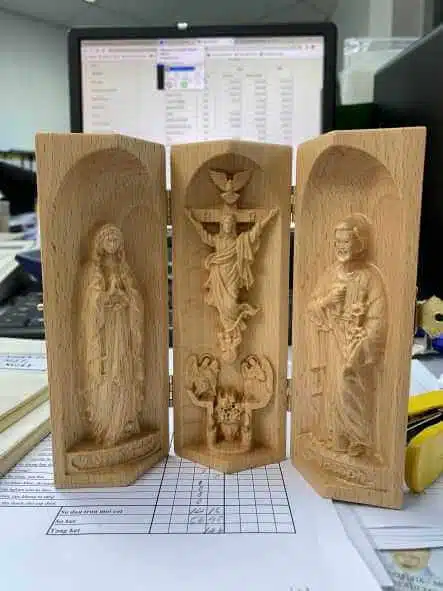 - Sản phẩm được làm bởi những máy CNC hiện đại dưới sự điều khiển của những người thợ có tay nghề cao và có nhiều năm kinh nghiệm trong lĩnh vực điêu khắc bàn thờ, tượng Công Giáo. Trước khi gia công, nguyên vật liệu đều được xử lý qua công nghệ sấy khô, đảm bảo khả năng chống mối, mọt.